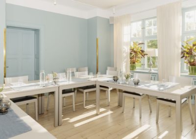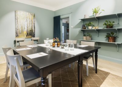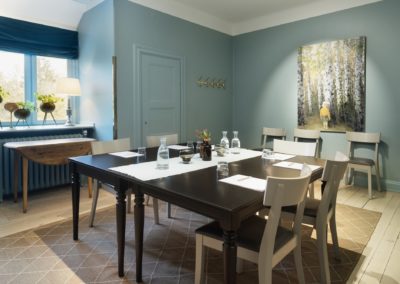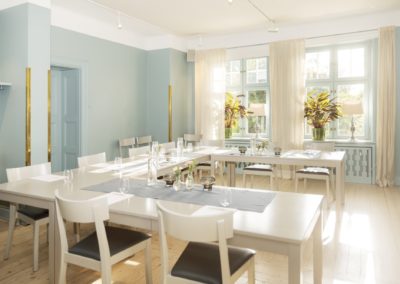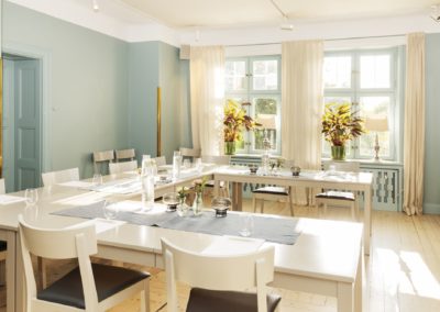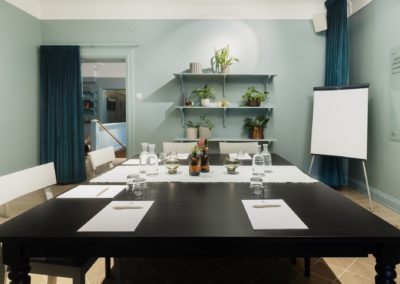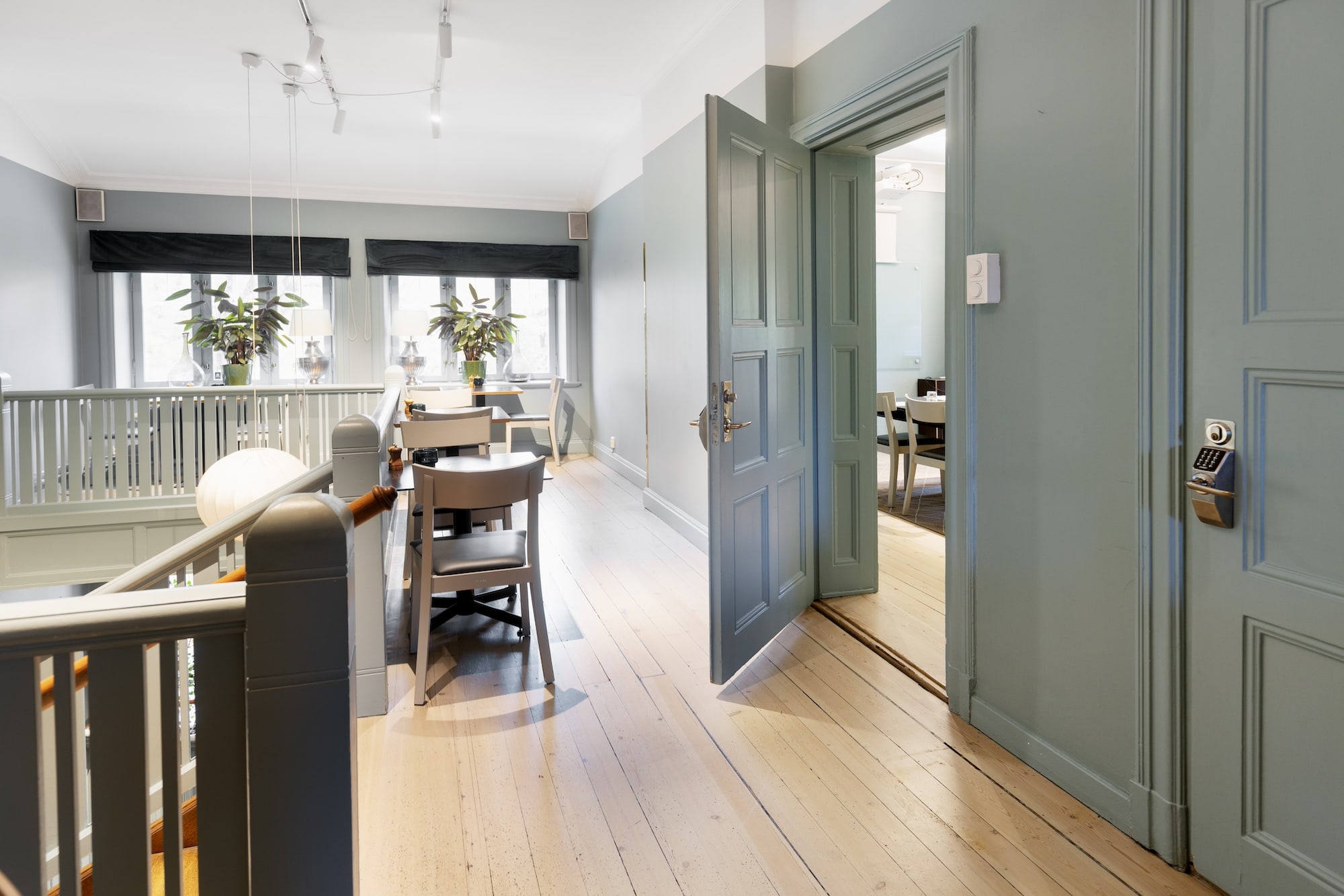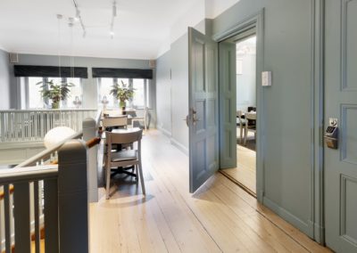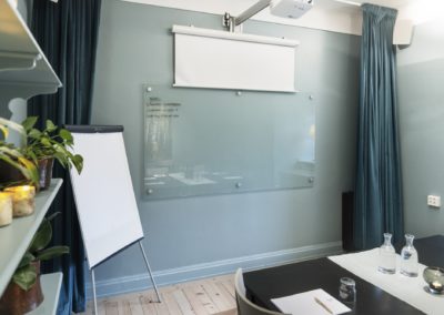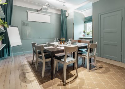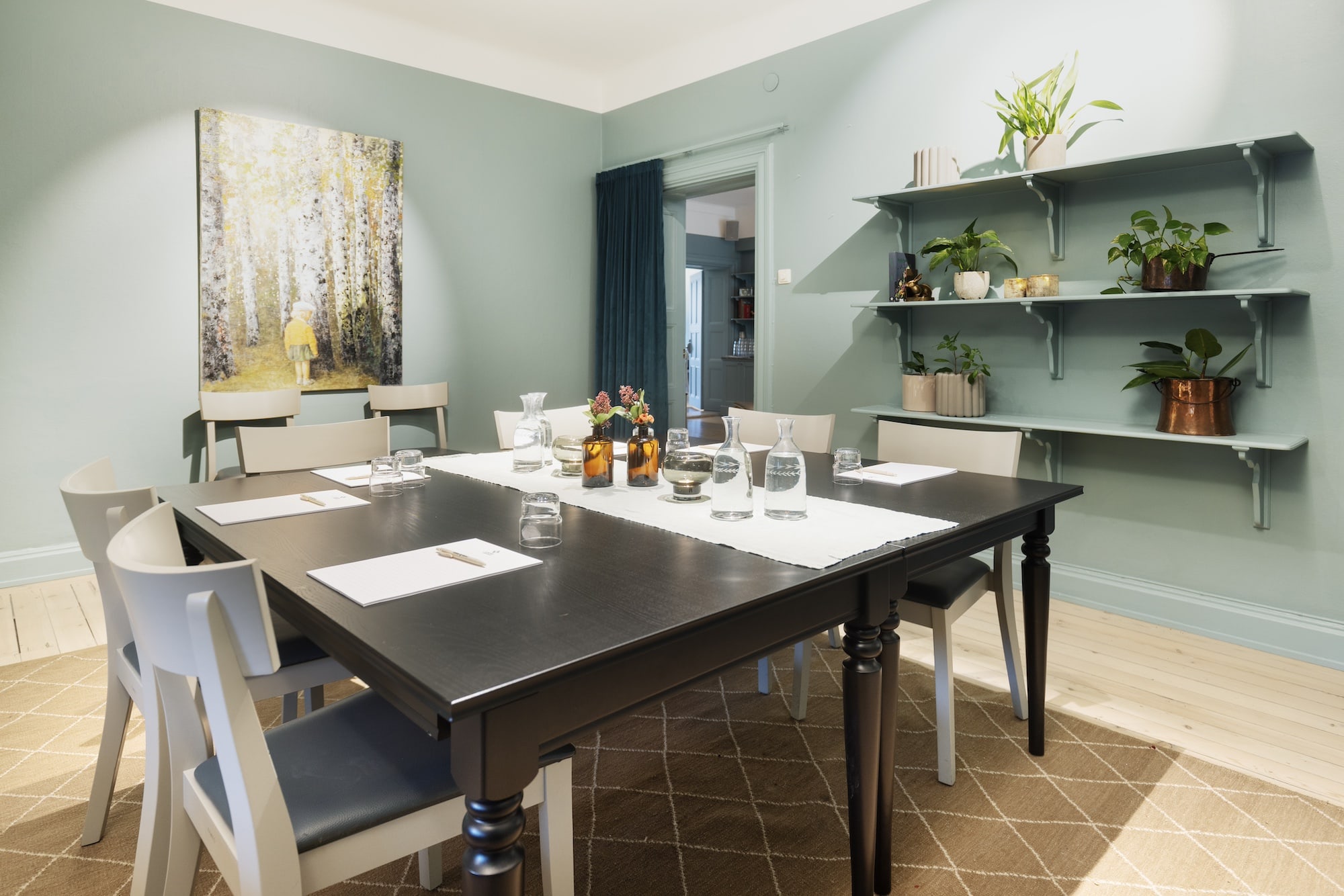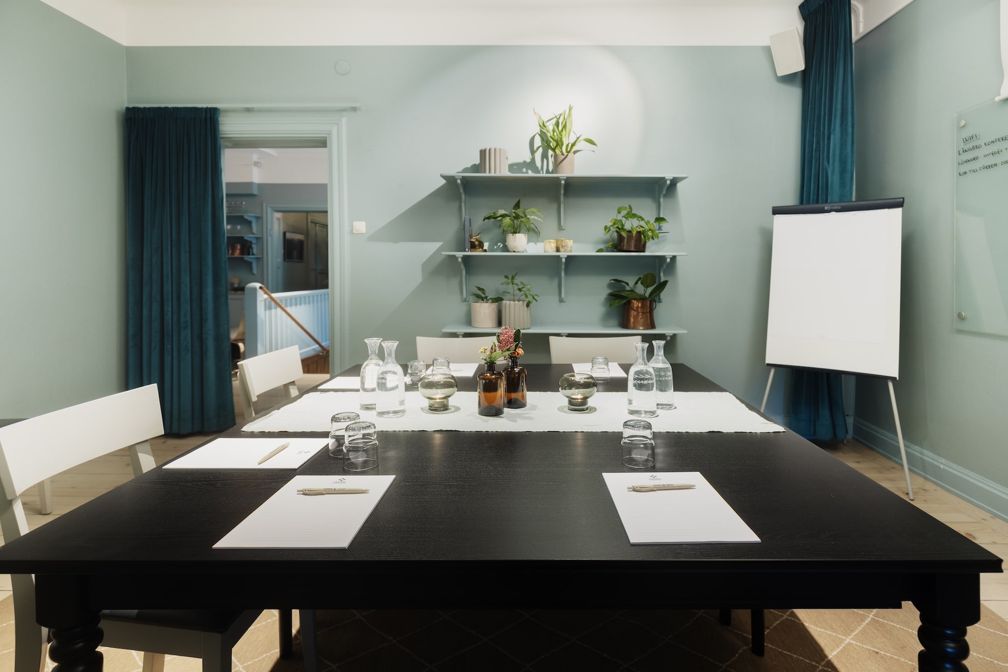 Mötesrummen hittar du en en trappa upp. Interiören och karaktären har mer hemma-hos-känsla än traditionella konferenslokaler. I huset finns wifi i alla rum. Tre av våra fyra mötesrum är utrustade med projektor, högtalare och whiteboard. Det fjärde och minsta rummet har plats för upp till sex personer, ett utmärkt val för privata middagar, affärsmöten och andra sammankomster.